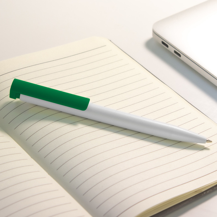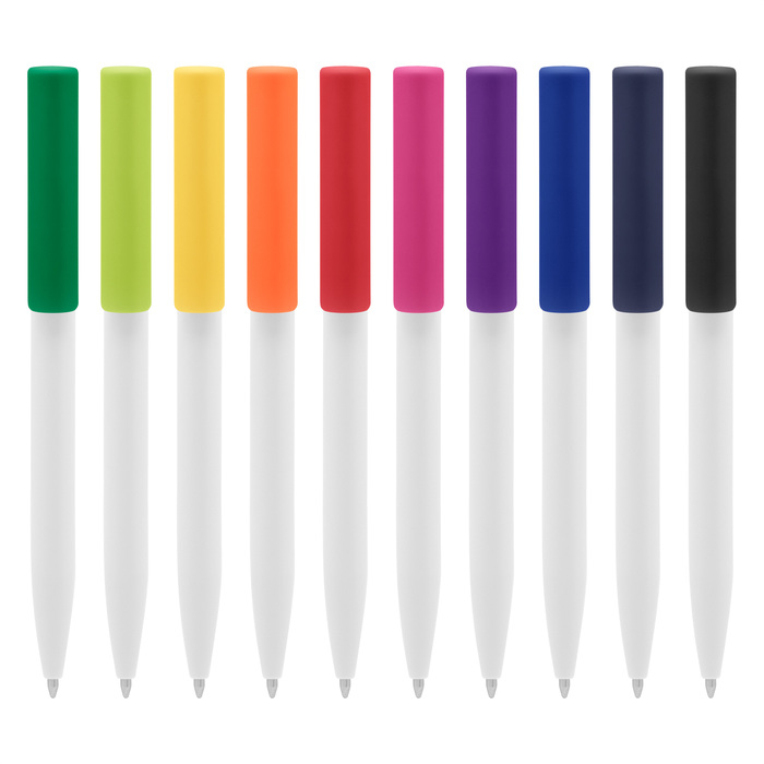 Plástico. Cuerpo blanco y clip de diferentes colores. Bolígrafo retráctil. Clip plástico de colores.