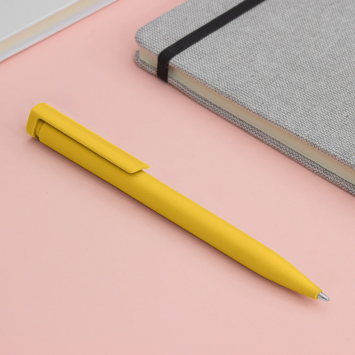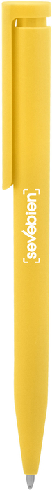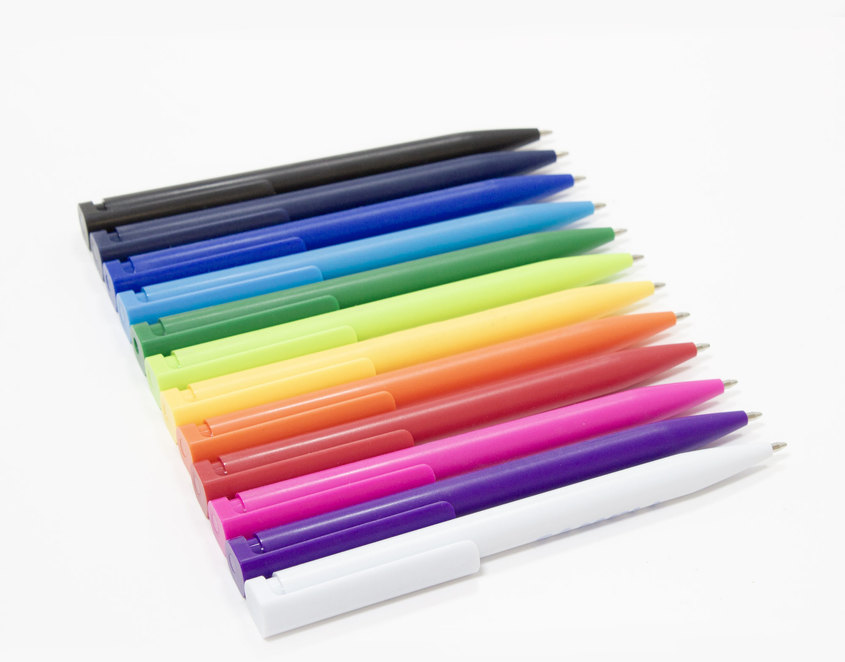 Cuerpo de diferentes colores. Bolígrafo retráctil plástico. Clip plástico del mismo color del cuerpo. Tinta negra. Sistema de botón push para destapar. Amplia área de impresión.