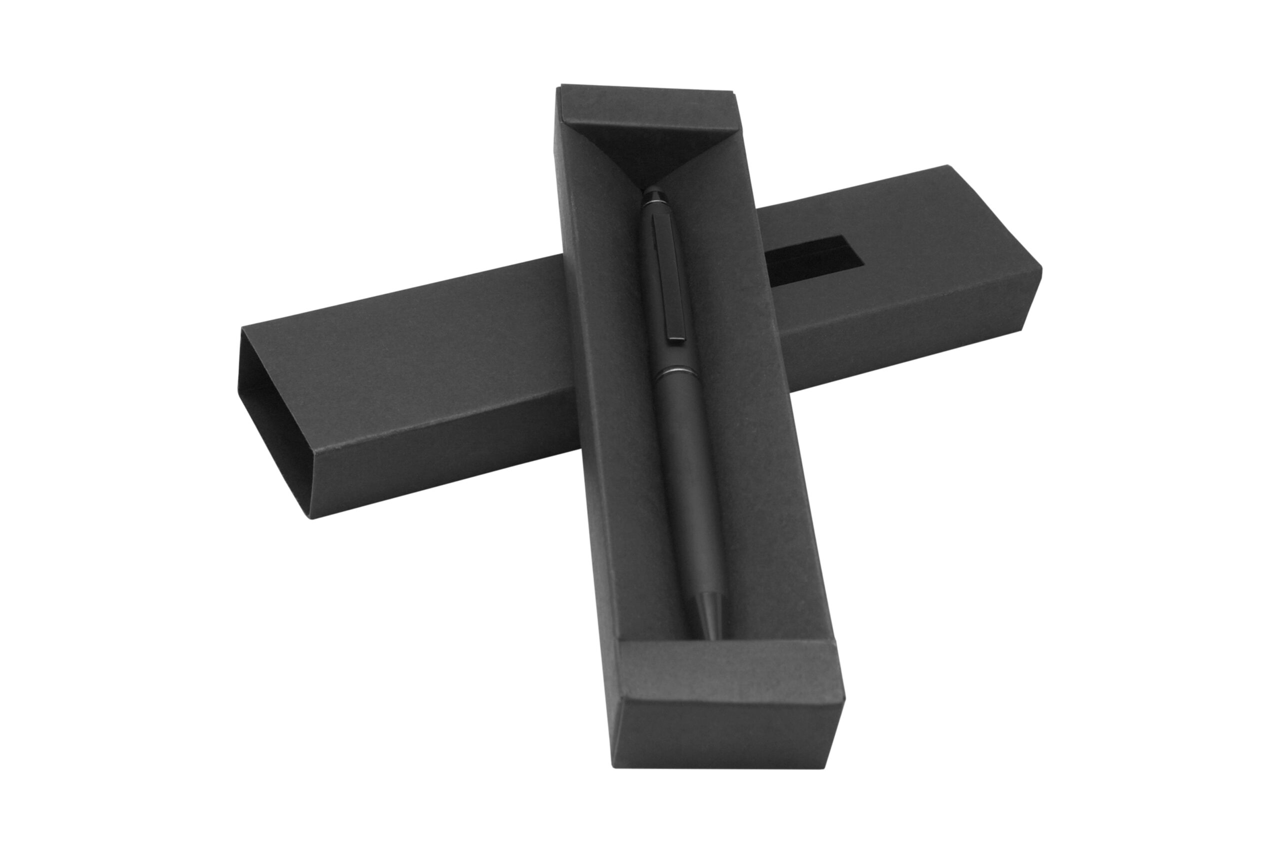 Metálico touch con apertura giratoria. Cuerpo color negro mate. Puntera y clip negro brillante. Tinta azul. Estuche de cartón negro.