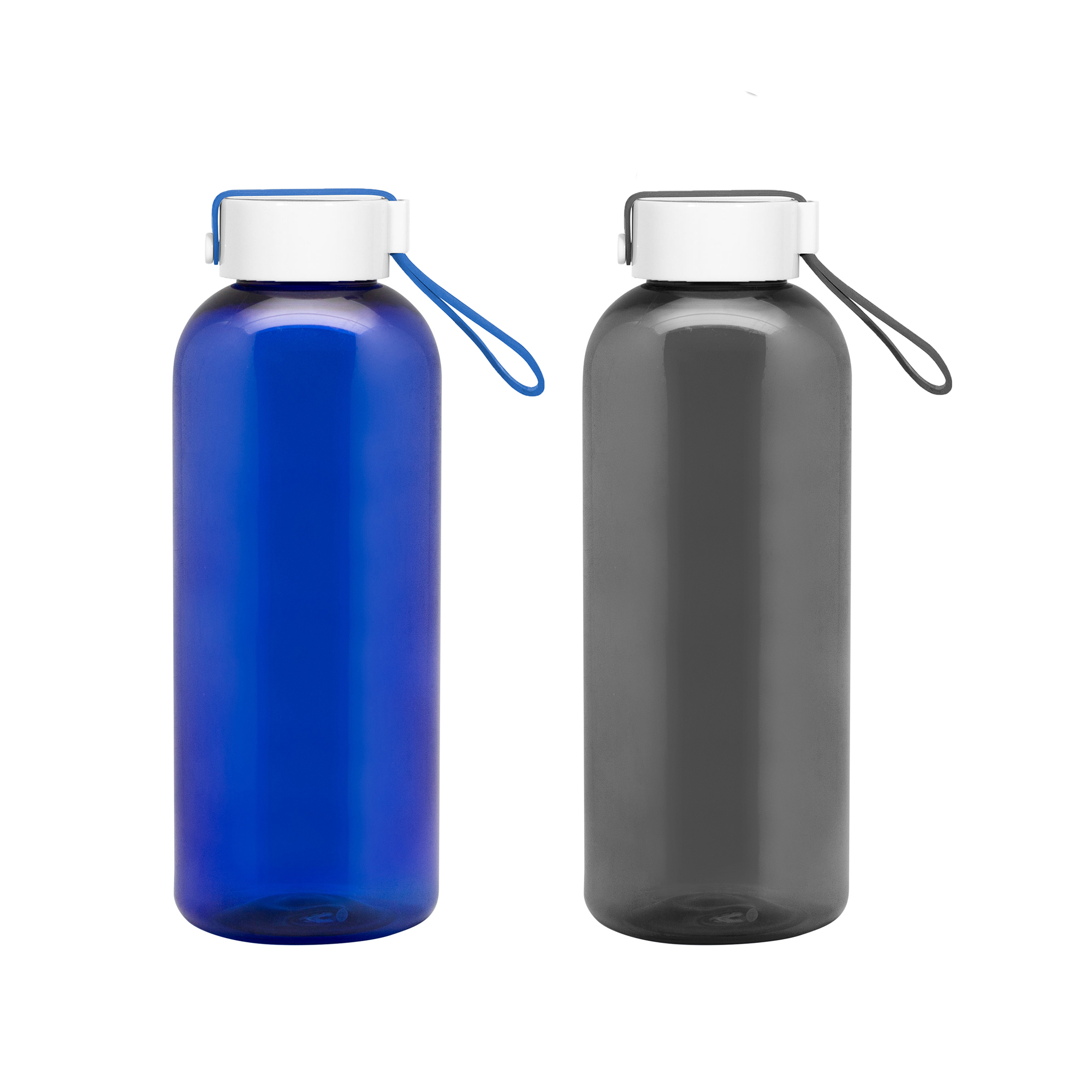 Ø 8 x 20,5 cm. Plástico PET. Capacidad 810 ml. Peso del botella: 63 gramos – Peso de la tapa: 12 gramos. Plástico. Cuerpo de color traslucido. No apto para bebidas calientes. Libre de BPA. Tapa según disponibilidad, con lazo o tipo asa.