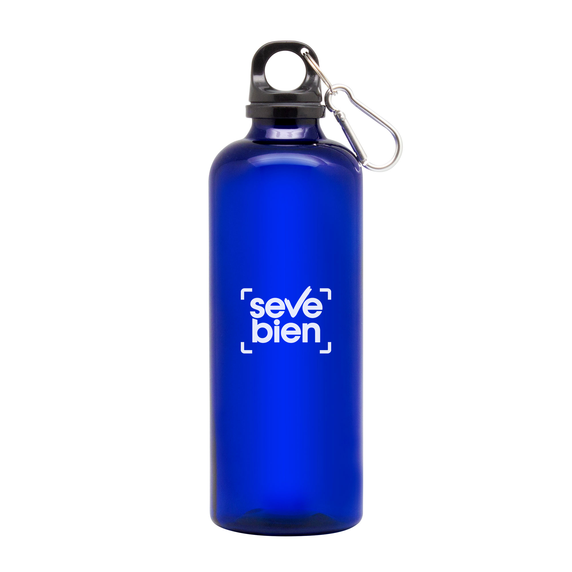 Capacidad 600 ml. Material PET. Botella de plástico de colores translúcidos. Tapa a rosca en color negro con anillo de silicona y mosquetón de aluminio plata. Ultra liviana, pesa 60g. Medidas Ø 7 x 23 cm.