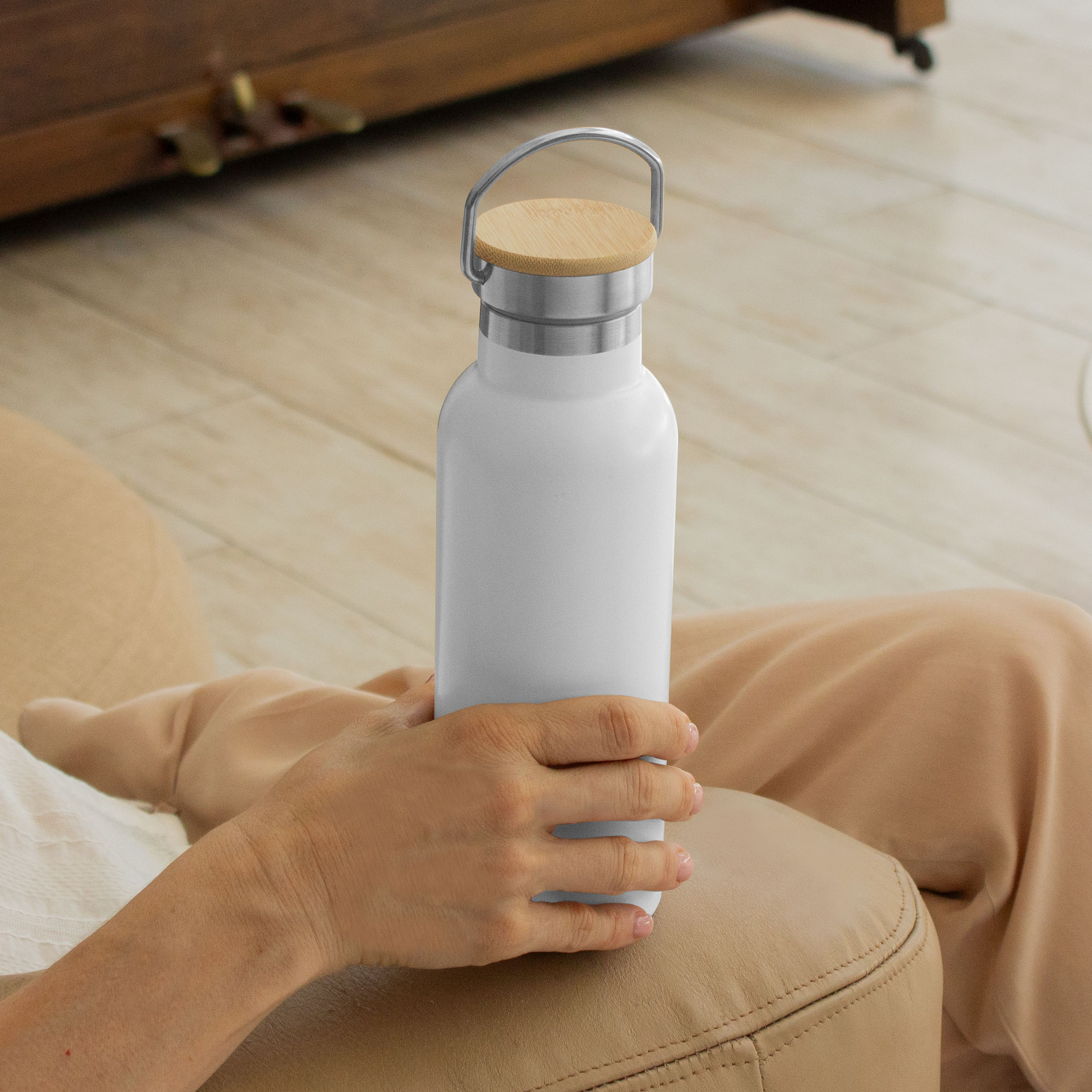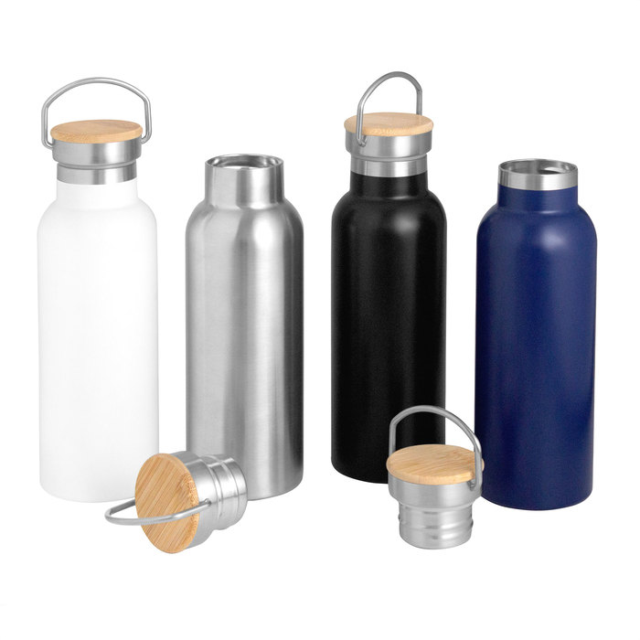 Térmica. Capacidad 550 ml. Acero inoxidable. Botella térmica doble pared sellada al vacío. Tapa de acero inoxidable con manija metálica rebatible y detalles en bambú. Anillo de silicona antiderrame.