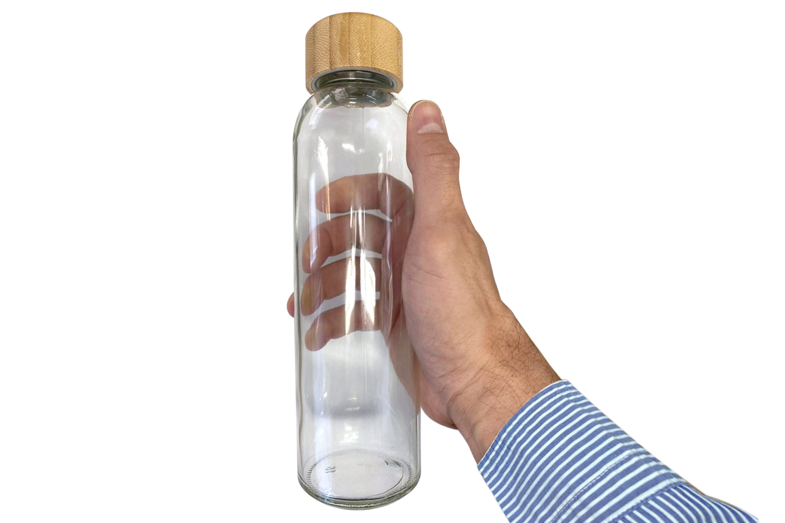 Novedosa botella de resistente vidrio, tamaño Ø 6,2 x 23 cm. Capacidad 500 ml. Cuerpo traslúcido con tapa rosca de bambú.