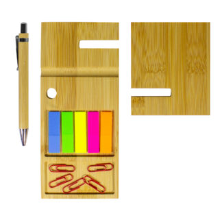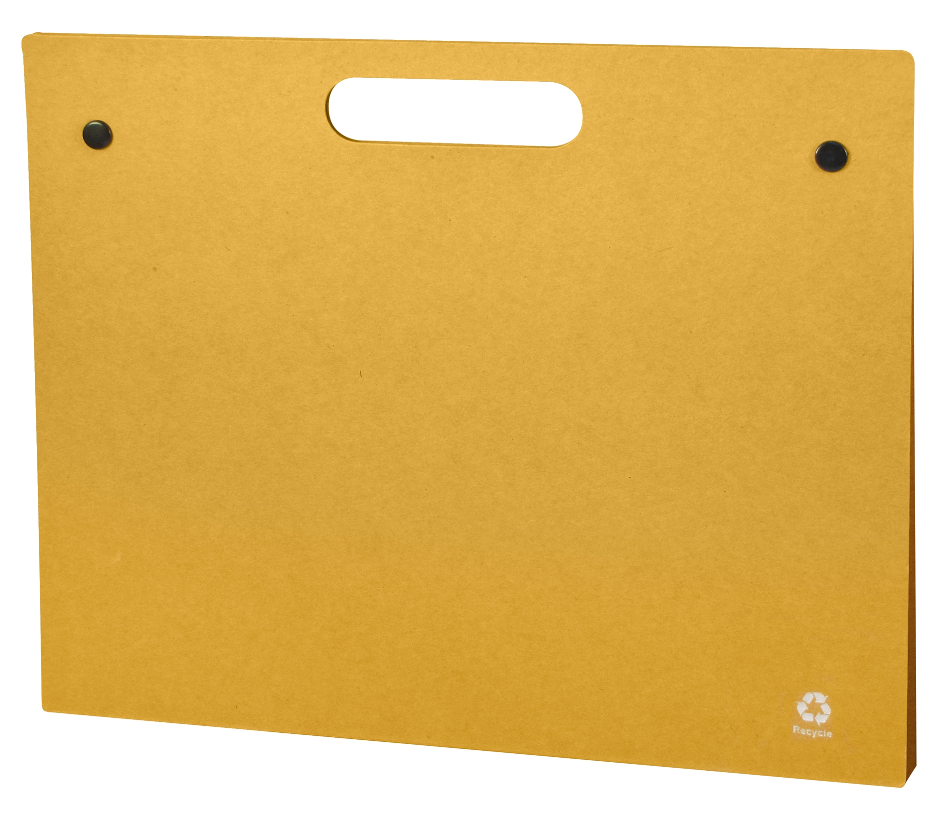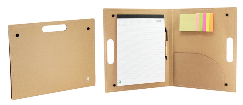 Carpeta Ecológica tipo Maletín, en cartulina reciclada, con broches. Incluye Block Lineado A4 20 hojas, 1 taco post-it de 25 hojas de 7,6 x 7,6 cm + 5 tacos de 25 banderitas post-it de 7,6 x 1,5 cm., bolsillo interior y 1 bolígrafo ecológico.