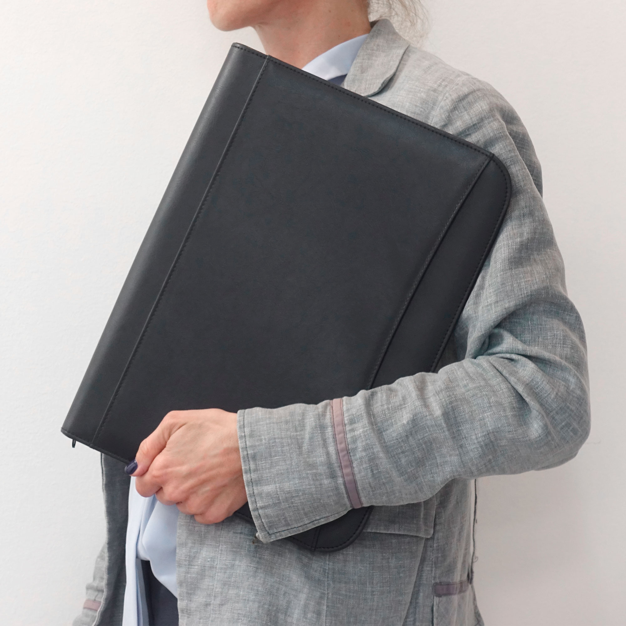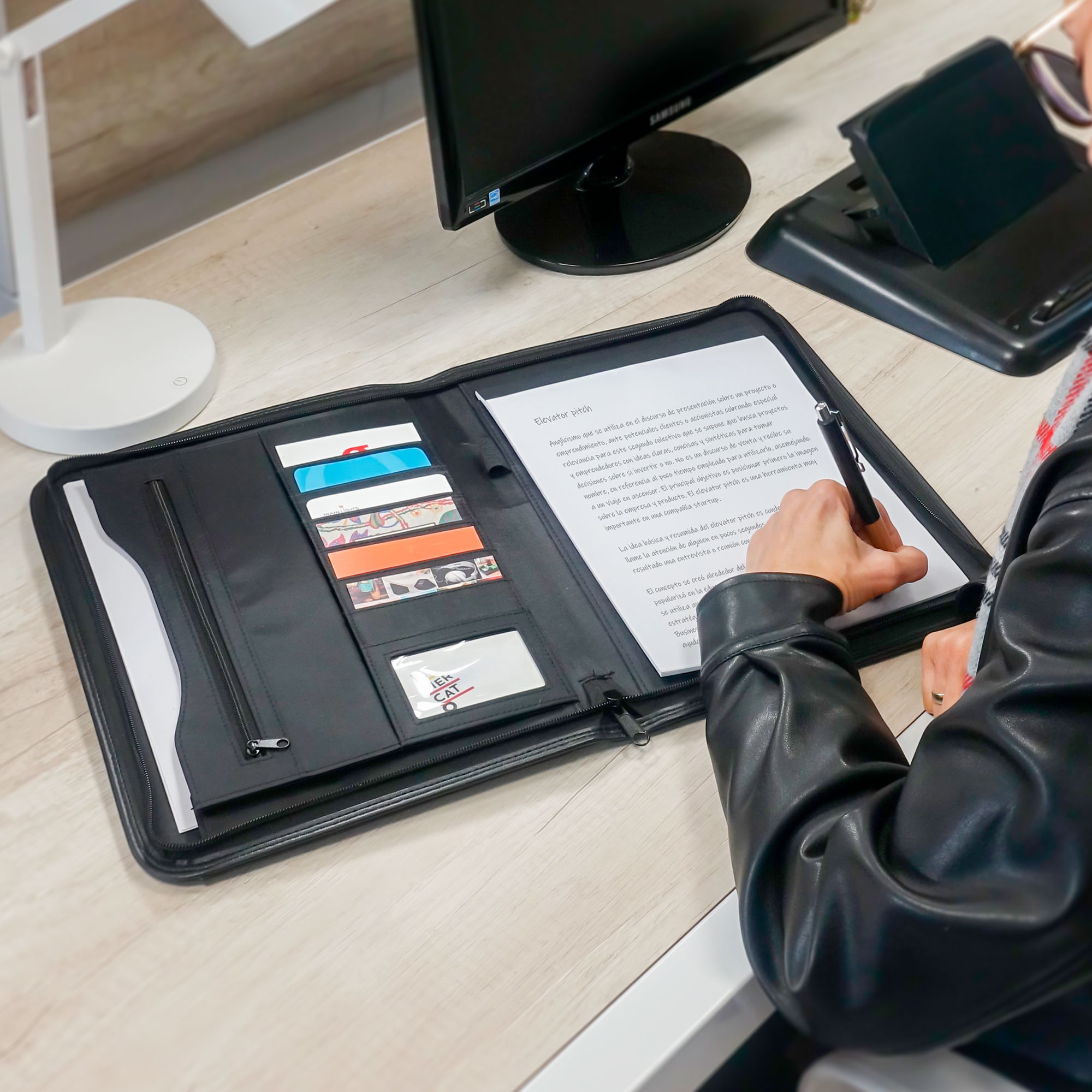 Tamaño 26 x 35 x 3 cm. PU . Éste material puede tener algunos beneficios ambientales sobre el cuero genuino, ya que no requiere de animales para fabricar y además, no necesita ser químicamente curtido, Carpeta con cierre. Contiene 1 block de 20 hojas lisas tamaño A4. Elástico para retener el boligrafo. Bolsillo externo. Compartimentos internos para 7 tarjetas. Sobre con fuelle y bolsillo interno con cierre.