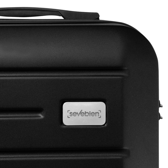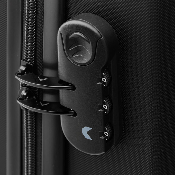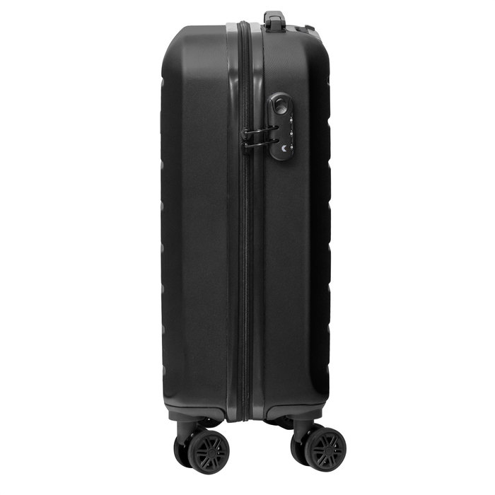 Capacidad 35 litros. Peso aproximado 2,7 kg. 100% ABS. Interior 210D. Valija / Maleta pequeña. 8 ruedas con giro 360°. Manija de transporte reforzada y engomada. Mango extensible hasta 48 cm. 2 posiciones. Interior: 2 compartimentos principales con cierre y elásticos ajustables. Placa metálica desmontable para grabado (medida: 5,3 x 3 cm.)
