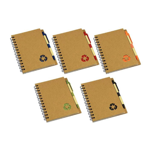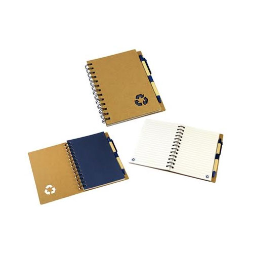 Cuaderno Ecológico con Tapas Duras de Cartón Reciclado 650gsm, 70 hojas interiores lineadas y anillado metalico doble cero. Incluye bolígrafo ecológico. Impresión en serigrafía.