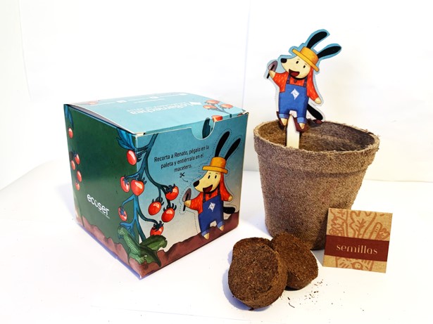 1 macetero fibra vegetal 8×8 cms., 3 comprimidos de » tierra mágica» en base a turba que al contacto con el agua se expanden y forman el volumen de tierra necesario para el macetero, 1 sobre con semillas a elección : tomate cherry, espinaca, lechuga, dedal de oro o caléndulas. Instrucciones de siembra impresas en la caja.