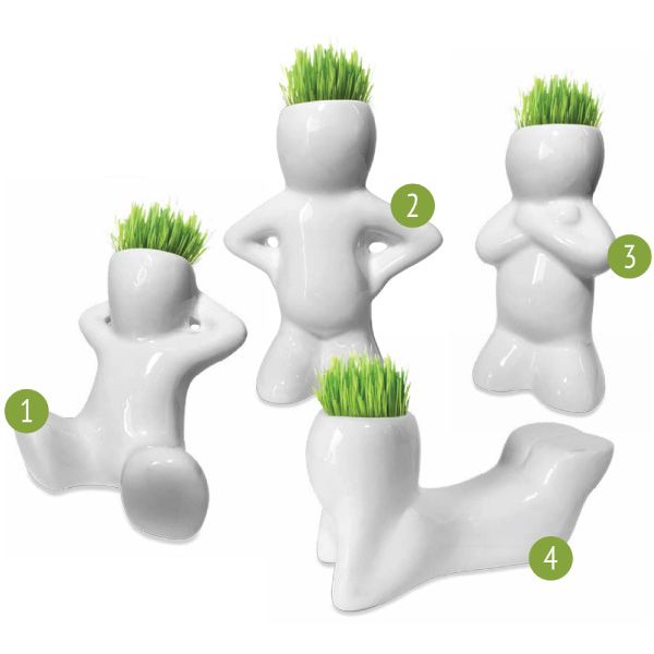 • 1 “señor Cabeza de Pasto” de cerámica. La cabeza contiene una bolsita con semillas de pasto, listas para regar y crecer.