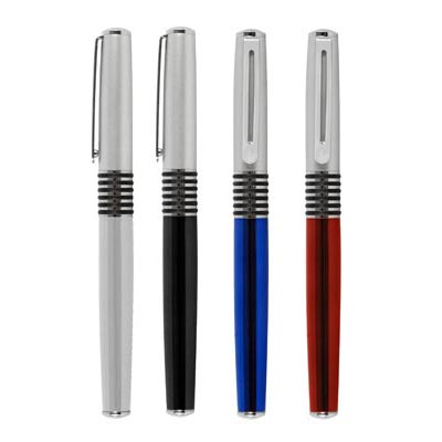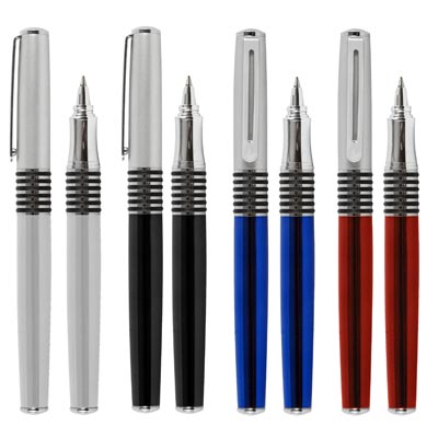 Lápiz Roller Ball Metálico modelo «Suizo», cuerpo de color metalizado y tapa plateada satin. Tinta negra.