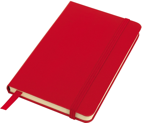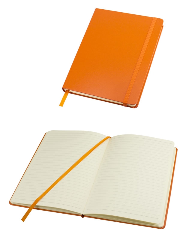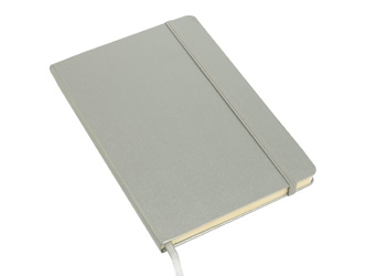Libreta tamaño 14 x 21 cms., 80 hojas, tapas cartón forradas en eco cuero, variedad de colores : negra, azúl, rojo, plata, naranja, banda elástica, cinta marcadora de páginas , logo en serigrafía, laser o cuño seco.