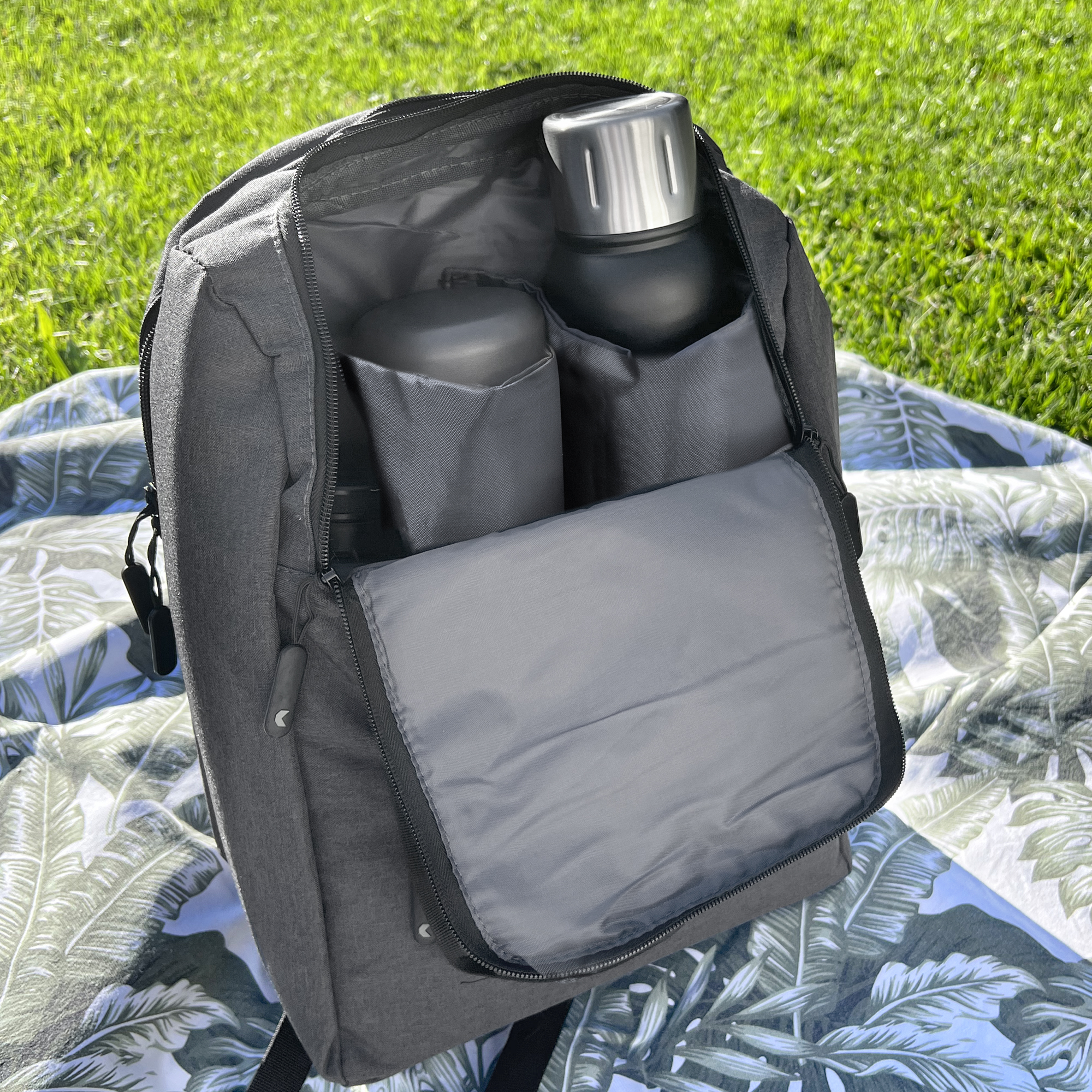 Mochila de paseo multiples usos, Tamaño 28 x 40 x 18 cm. Capacidad 20 litros. Poliester 300D. Bolso matero con dos grandes compartimentos. Compartimento principal desplegable que cuenta con divisiones para transportar termo, mate y recipiente para la yerba. Segundo compartimento amplio para múltiples usos. Bolsillo frontal con cierre. Cierres con detalles de goma. La parte posterior cuenta con tiras regulables con hebillas plásticas y en la parte superior dos tiras con cierre a presión que lo convierten en bolso de mano.