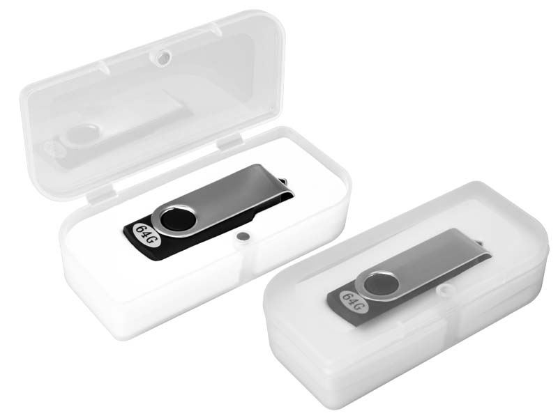 Pendrive 64 GB de memoria, carcaza metálica de giro, estuche PVC translúcido.