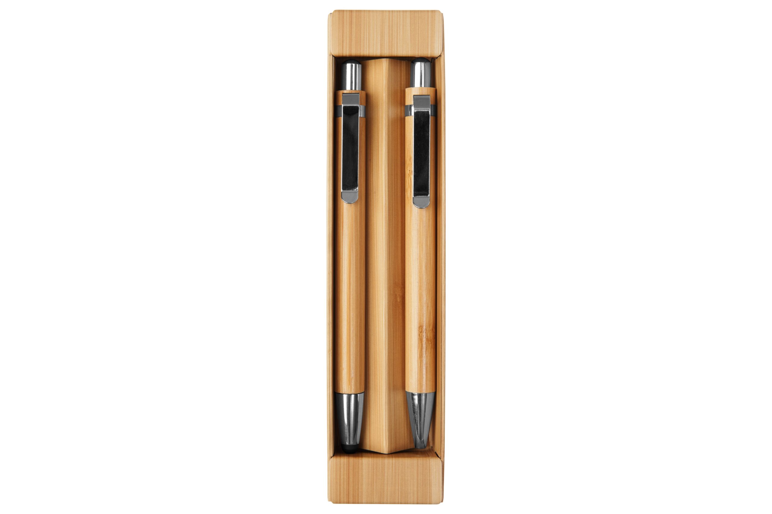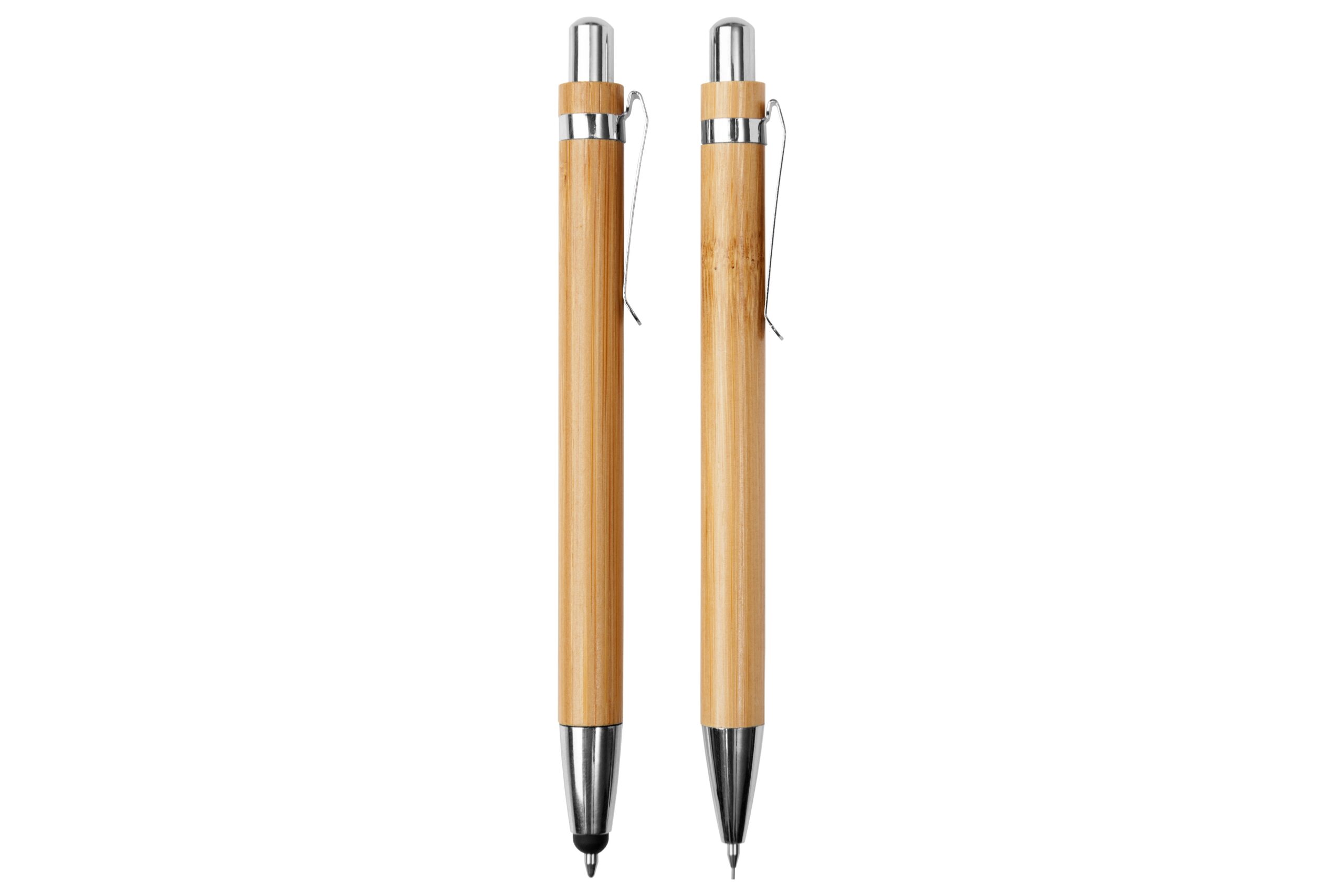 Set de lápiz pasta y lápiz mecánico. Cuerpo de madera. Clip metálico. Punta y pulsador de plástico. El lápiz pasta es con punta touch. Viene en caja de cartón diseño simulación madera.