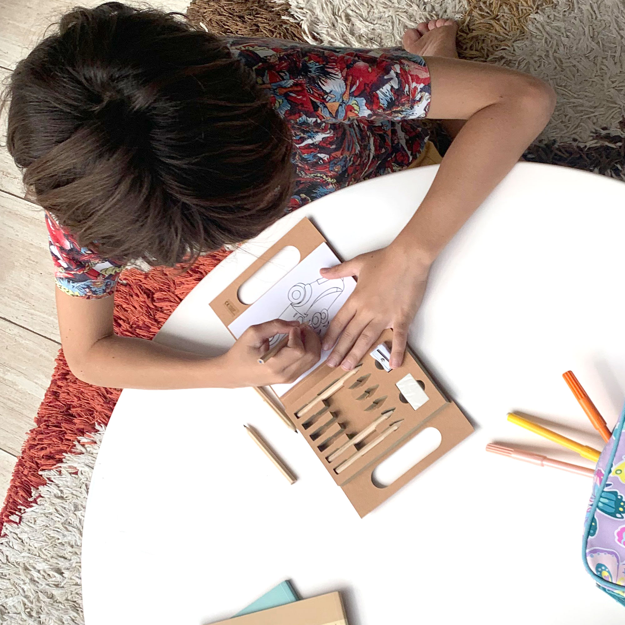 Regalo atractivo y económico. Set para dibujar tamaño14,5 x 14,5 x 1,8 cm (cerrado). Set de papel madera reforzado con manija para colorear y llevar a todos lados. 6 lápices de madera en diferentes colores (negro, marron, verde, azul, rojo y amarillo). 30 hojas con diseños varios para colorear. 1 goma de borrar y 1 sacapuntas.