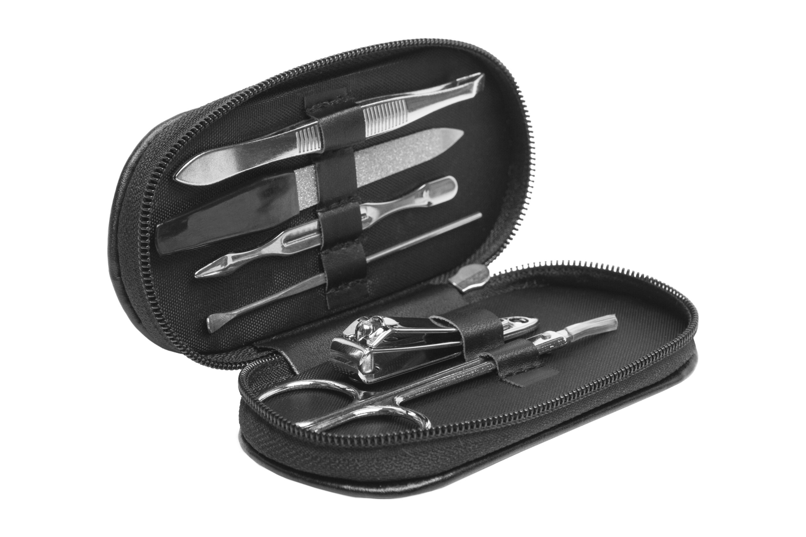 Tamaño 11 x 5 x 2 cm. (cerrado) 11 x 12,5 x 1,1 cm. (abierto). Set de manicura. Metal y simil cuero. Estuche organizador con cierre que contiene: tijera, alicate, 2 limpia cutículas, lima metálica y pinza de depilar.