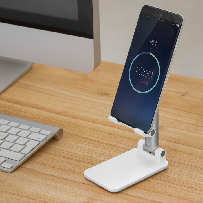 Plástico ABS mate + EVA. Soporte plegable para móvil. Tiene un sistema extensible de ajuste de altura e inclinación para posicionar el celular. Base con apliques de silicona antideslizantes. Presentación en caja de regalo kraft.