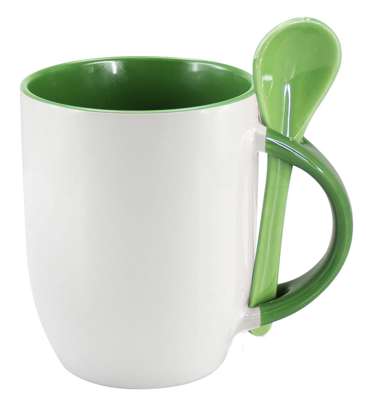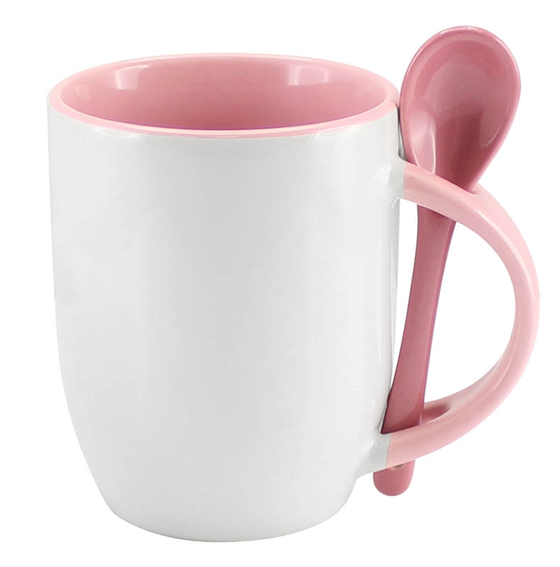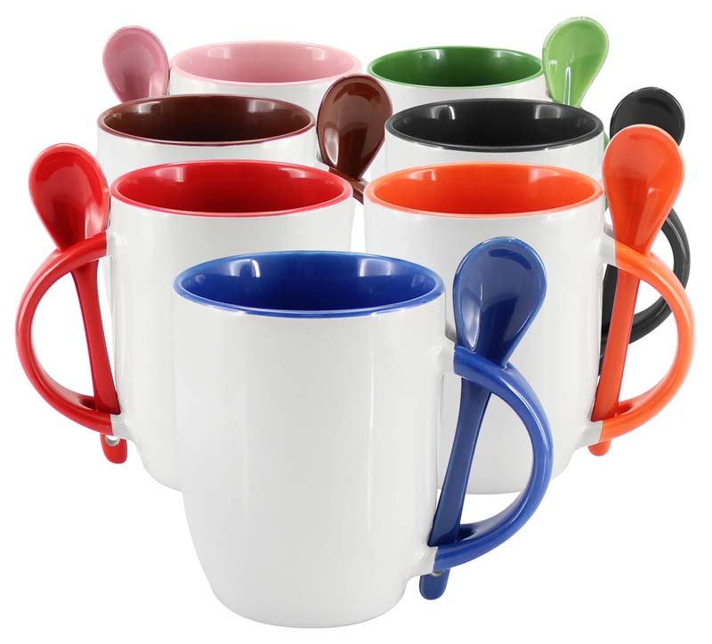 Tazón Cerámico blanco con interior, asa y cuchara de color, cobertura exterior con polímero especial marca ORCA COATINGS(R) para una sublimación de primera calidad. Cada unidad se entrega dentro de su caja individual de cartón blanco. capacidad 350 cc.